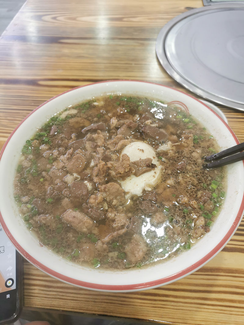 车站周边是没有合适的早餐点,需要左拐走下坡,一直走过公交车停车区,选择在大马路边的粉店,就近吃了一份杀猪粉花费12.9元。