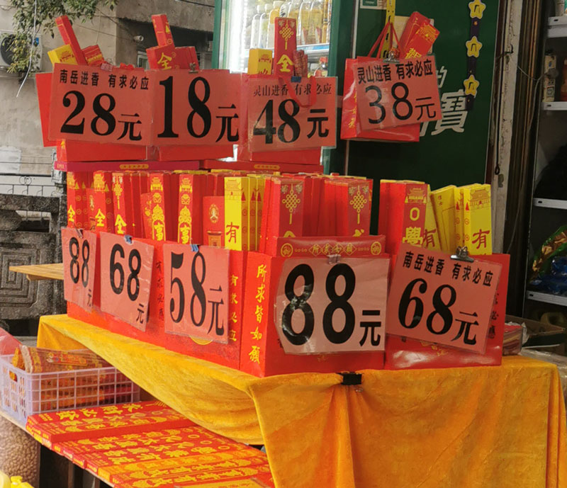 到了这里,就是要买香火了,但你根本不用担心,景区外面全部是卖香的,最低18元起。就算不买香,验票进门后是可以免费领三炷香的。但需要特别注意景区是只能带特定的环保香进去,至于怎么判断是不是环保香,我不是很清楚,反正景区门口卖的肯定是环保香了。南岳大庙香火鼎盛,周围卖香的实在太多了,喊客拉客的人也很多,我一般是不理他们,如果不懂的话最容易被他们坑了,去明码标价的商店购买就行。我每年都会抽空去一次南岳大庙,个人感觉在买香这件事上人均花费超过100就算大冤种了,因为我曾经就是大冤种。烧香礼佛讲究心诚则灵,硬要讲究起来,有很多规则的,咱们俗家人只做到 心诚就行。