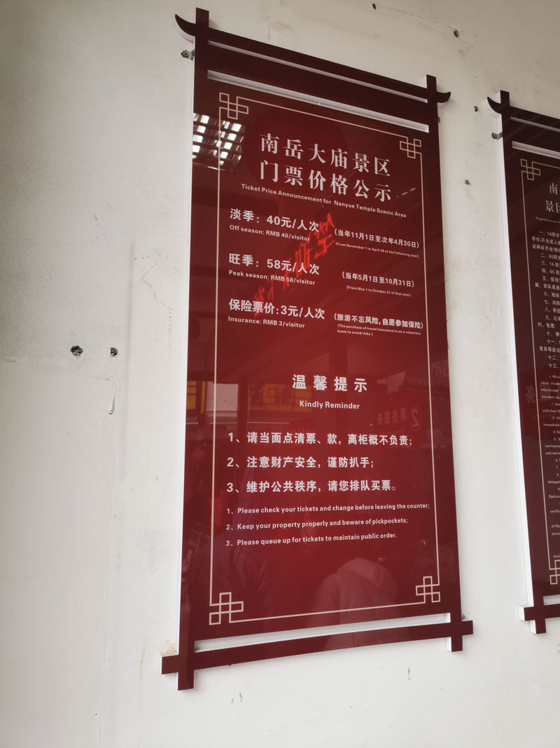南岳大庙的门票价格是40元,可另外购买保险3元。后面就是进大庙了,其中还有些规则比如香火不能放地上、不能拍照、男左女右的走,我懂的不多,就不献丑了。我从棂星门检票进入,经奎星阁、圣帝殿等等,绕一圈全部逛完后到靠近北后门的财神殿,从北后门出去,时间大约花费1小时30分。我是逛的慢,如果走马观花最快半小时就能逛完。